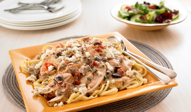 Preheat oven to 375°F. Arrange chicken breasts in 9 x 13 baking dish. Bake chicken until internal temperature reaches 165°F, 30 to 40 minutes depending upon whether you’re starting with fresh or frozen meat. (If you have cooked chicken on hand, omit this step.)