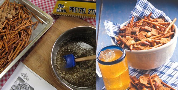 Making this snack mix couldn’t be easier, and I love that it includes cereal and nuts. Start by putting the cereals, pretzels and nuts onto a jelly-roll pan. Buy cereals and pretzel sticks you like because you’ll end up with some extras.