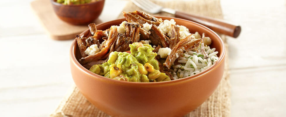 Rice Bowl with Grilled Corn Guacamole – This one is a staple at our house. Plan ahead and slow cook the beef barbacoa on Sunday, then serve these burrito bowls at home any night during the week. Or pack them for lunch instead of your usual sandwich.