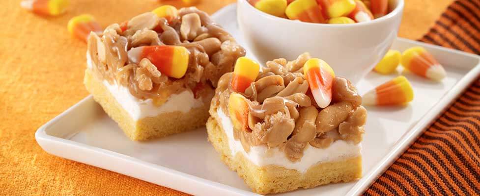 Combine corn syrup, sugar and brown sugar in saucepan. Cook over medium heat, stirring 2-4 minutes or until mixture comes to a boil. Remove from heat; stir in peanut butter and vanilla until smooth. Stir in cereal, peanuts and candy corn. Immediately spoon over marshmallows; spread to cover.