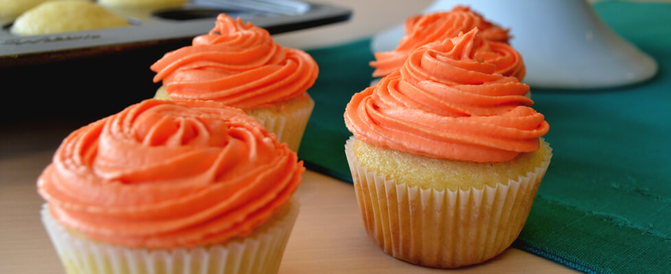 Candy Corn: Divide the frosting into 3 bowls, two with 1 1/2 cups each and the third with 1/2 cup. Color the two larger bowls of frosting orange and yellow, and leave the remaining 1/2 cup of frosting white. Pipe the frosting onto mini-cupcakes using a star tip, starting with yellow, then orange, and finally white, so the cupcakes resemble a piece of candy corn.